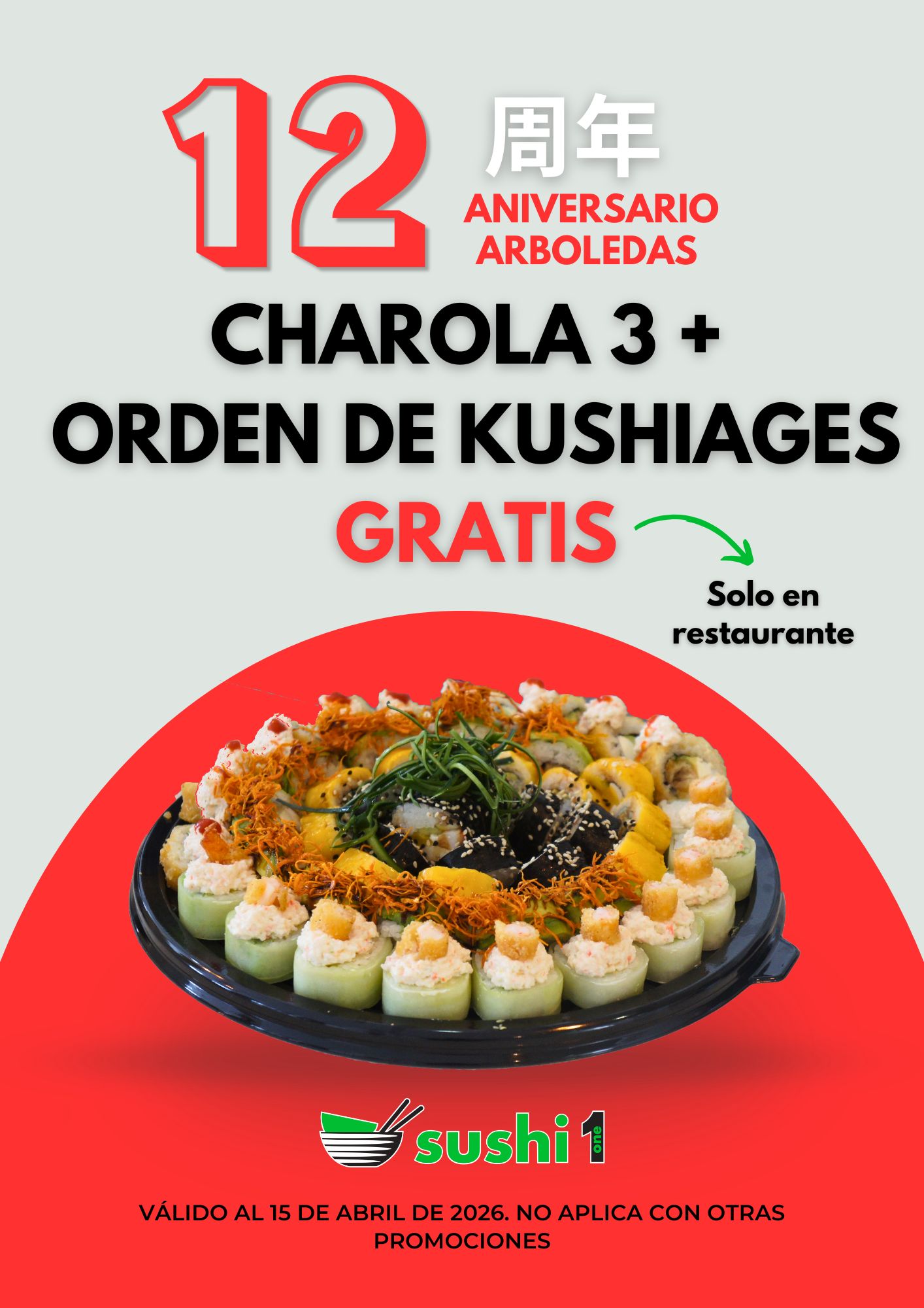 🎉 Aniversario 12: Charola 3 + kushiages GRATIS 🍣 👥 Ven con 2 personas más 🎁 y te regalamos 3 kushiages de queso 🔥 Perfecto para compartir 📍 Solo en restaurante Arboledas y Satélite (No aplica para llevar ni a domicilio) ⏰ Válido al 15/04/26 (No aplica con otras promociones) 🍣 Elige 3 rollos especiales y 2 tradicionales
